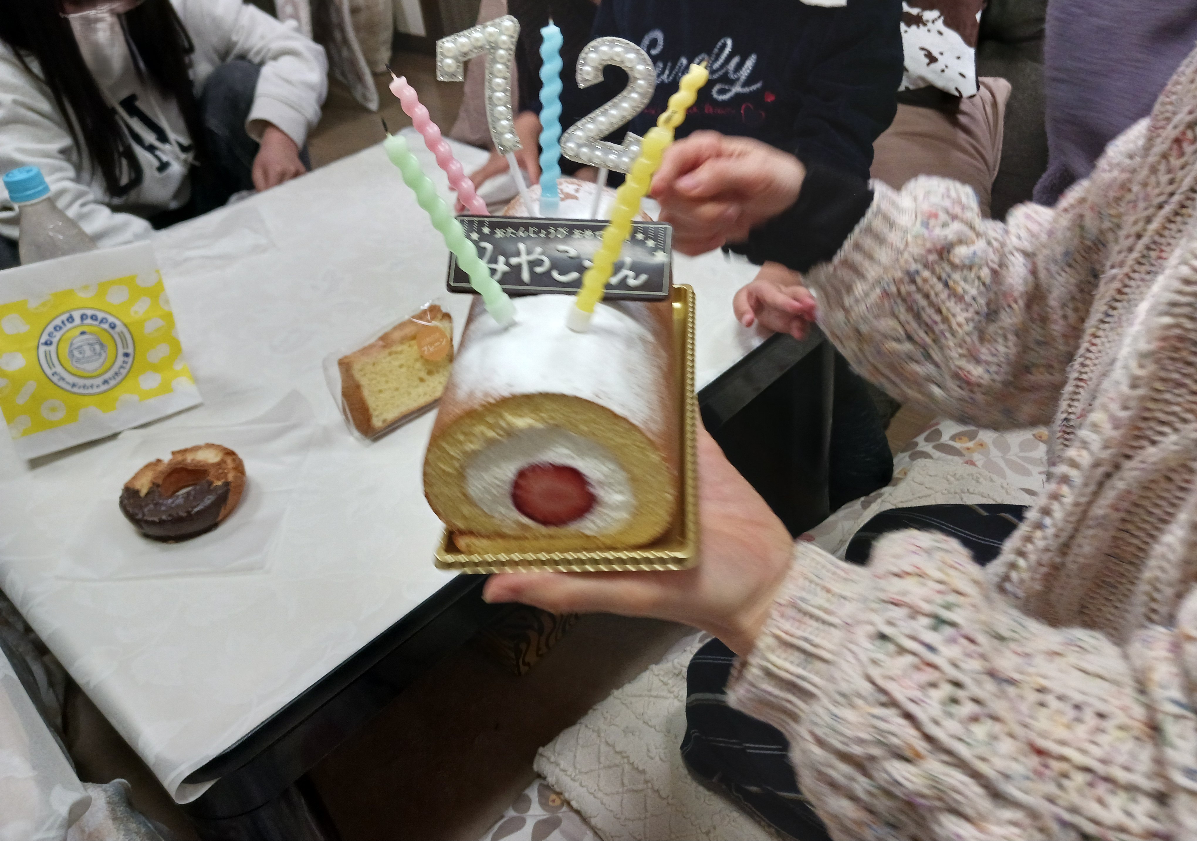 お祝いの主役は、ビアードパパで選んだイチゴたっぷりのロールケーキ。 「72」のキャンドルを立てて、お店で書いてもらった「みやこ」のプレートをのせたら、母も「可愛い!」と大喜び。その笑顔を見て、僕たち家族もすごく嬉しい気持ちになりました。